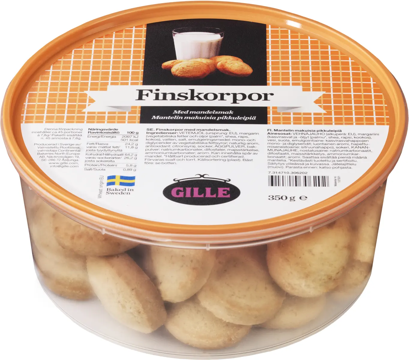 Ingredienser: VETEMJÖL (ursprung: EU), margarin (vegetabiliska fetter och oljor (palm*, shea, raps, kokos), vatten, salt, emulgeringsmedel: mono-och diglycerider av vegetabiliska fettsyror; naturlig arom, antioxidant: citronsyra), socker, ÄGGPULVER, bakpulver: natriumkarbonater, difosfater, majsstärkelse, ammoniumkarbonater; arom. Kan innehålla spår av mandel. *Hållbart producerad och certifierad.