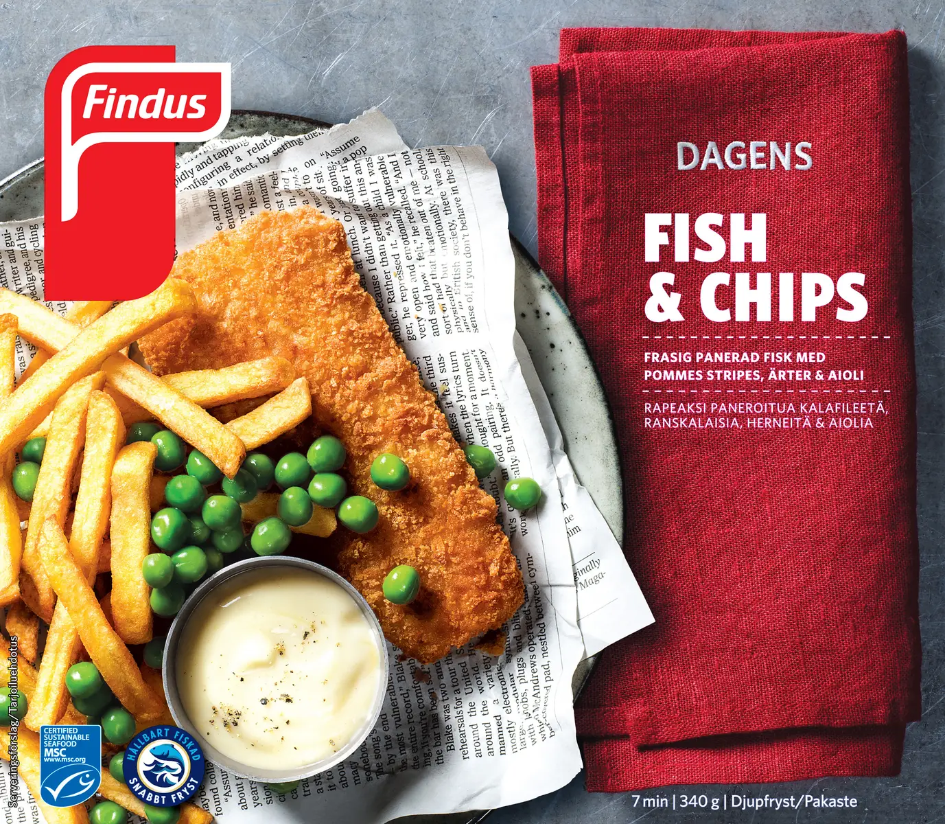 Finns det något mer brittiskt än Fish & Chips? En frasig MSC-märkt fisk med en panering på rismjöl och kikärtsmjöl. Den panerade fisken serveras med pommes frites, krämig aioli och gröna ärter. Smarrigt och enkelt!