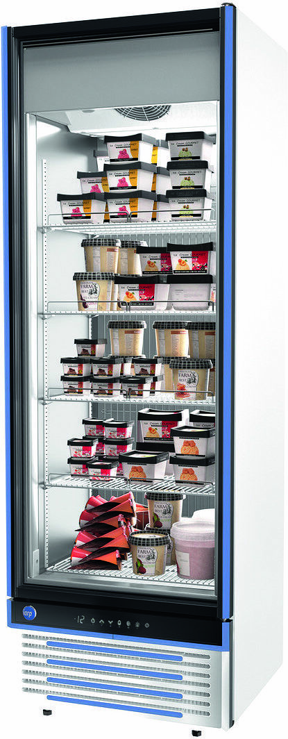 Frysskåp med glasdörr för maximal exponering och försäljning av frysta produkter och livsmedel. Självklart förberedd för 2020.