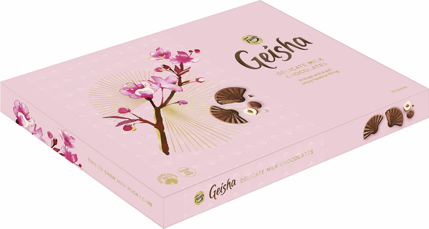 Geisha är en härlig klassiker frÃ¥n Fazer som nästan alla känner till. Nu finns Geisha Chokladpraliner  en ask med solfjäderformade praliner. De har ett sammetslent mjölkchokladöverdrag och en krispig fyllning av hasselnötsnougat. Och bäst av allt: alla Fazers goda chokladprodukter tillverkas av 100 % ansvarsfullt producerad kakao. Ta en paus och avnjut en pralin eller tvÃ¥. Den vackra GeishaÂasken är ocksÃ¥ en perfekt present.