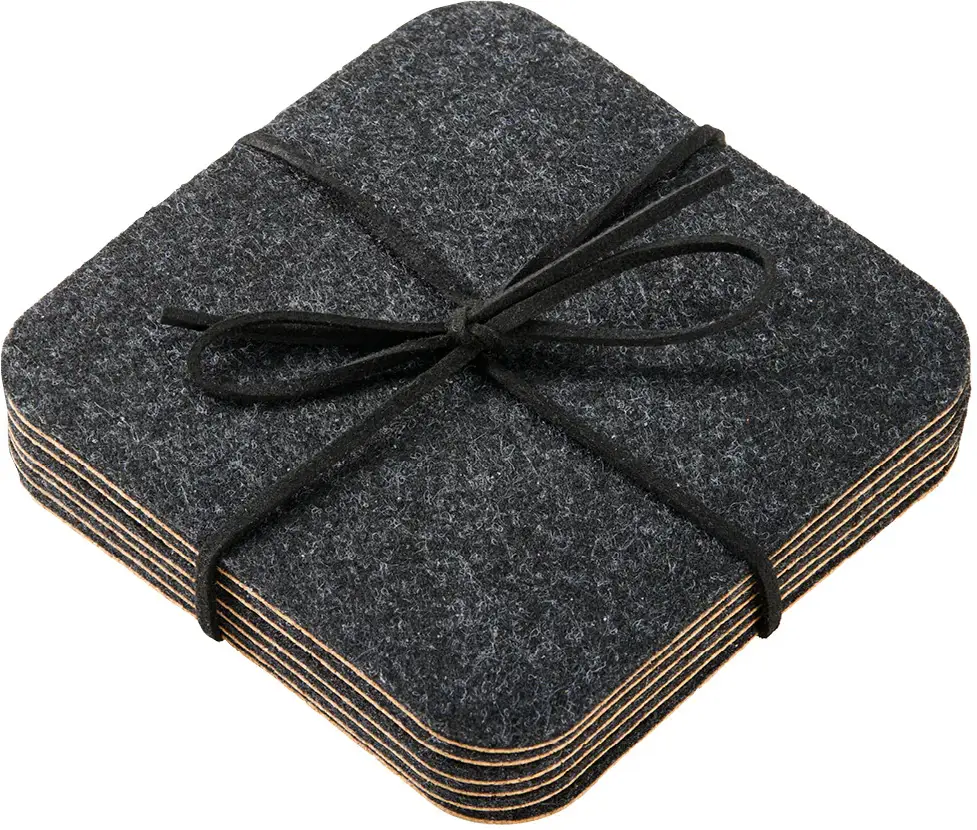 Förnya din bordsservering med våra stilrena glasunderlägg i filt, med korkbotten. Hållbara och estetiska. Uppgradera ditt hem med dessa eleganta glasunderlägg i svart idag!