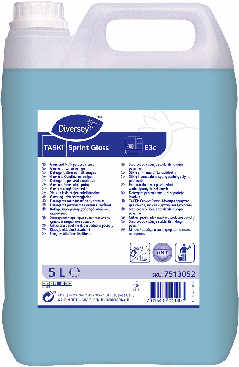 Brukslösning i dunk för sprayrengöring av glas, speglar och andra högblanka ytor, lämnar inte några rester, med färg, med parfym, ej ammoniak. Används tillsammans med återfyllningsbar sprayflaska.