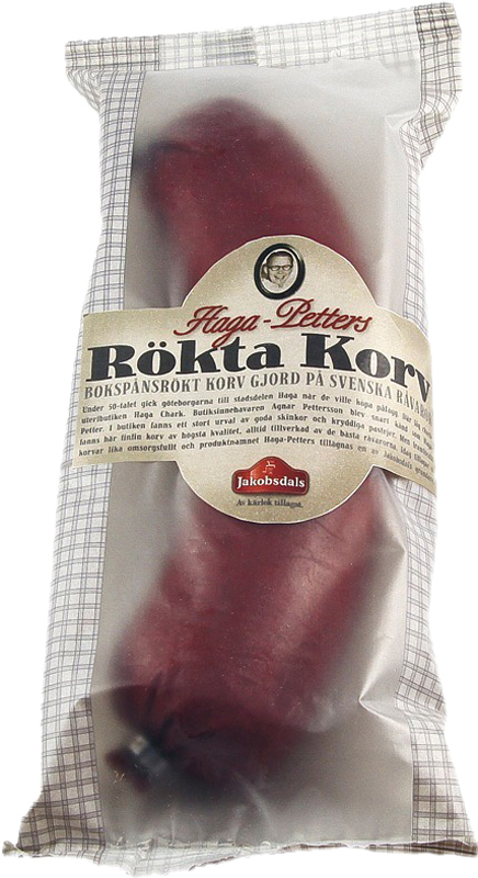 Späck blandas med magert svenskt kött och potatismos. Vi låter korven rökas på traditionellt sätt över bokspån, en utdragen procedur som kan ta olika lång tid varje gång. Korven har löksötma och syrlighet i god balans, med spänst i varje tugga. Doften tar dig till svunna tider – en finfin skapelse i farfar Agnar ”Haga-Petter” Petterssons anda.