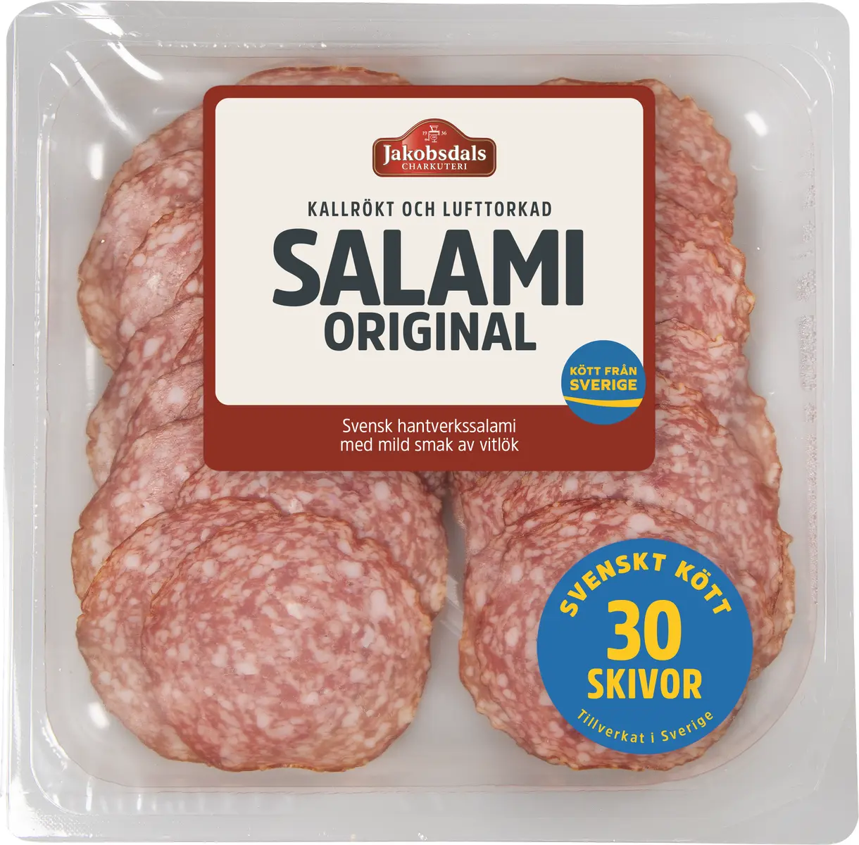 Griskött, salt, vitlök, kryddor, antioxidationsmedel E301, socker, konserveringsmedel E250. Till 100 g färdig vara har 142 g kött använts.