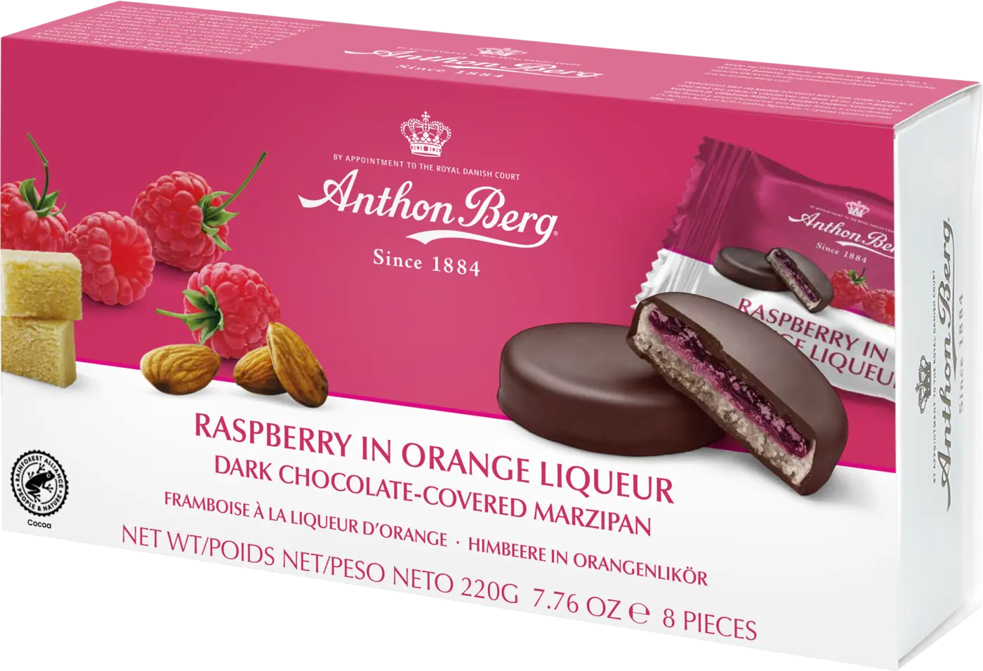 Anthon Berg choklad med marsipan och fyllning med hallon i apelsinlikör.