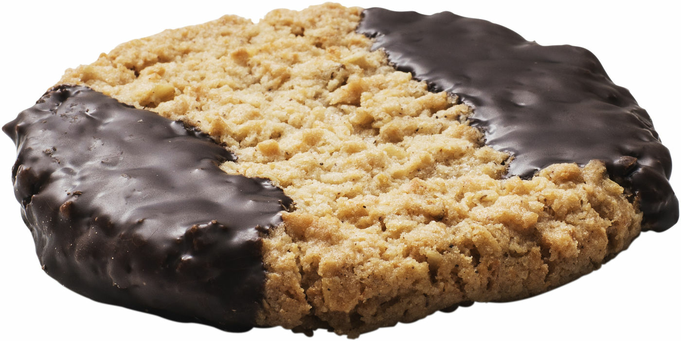 Knaprig havrekaka med smak av kokos och kanel, garnerad med choklad.