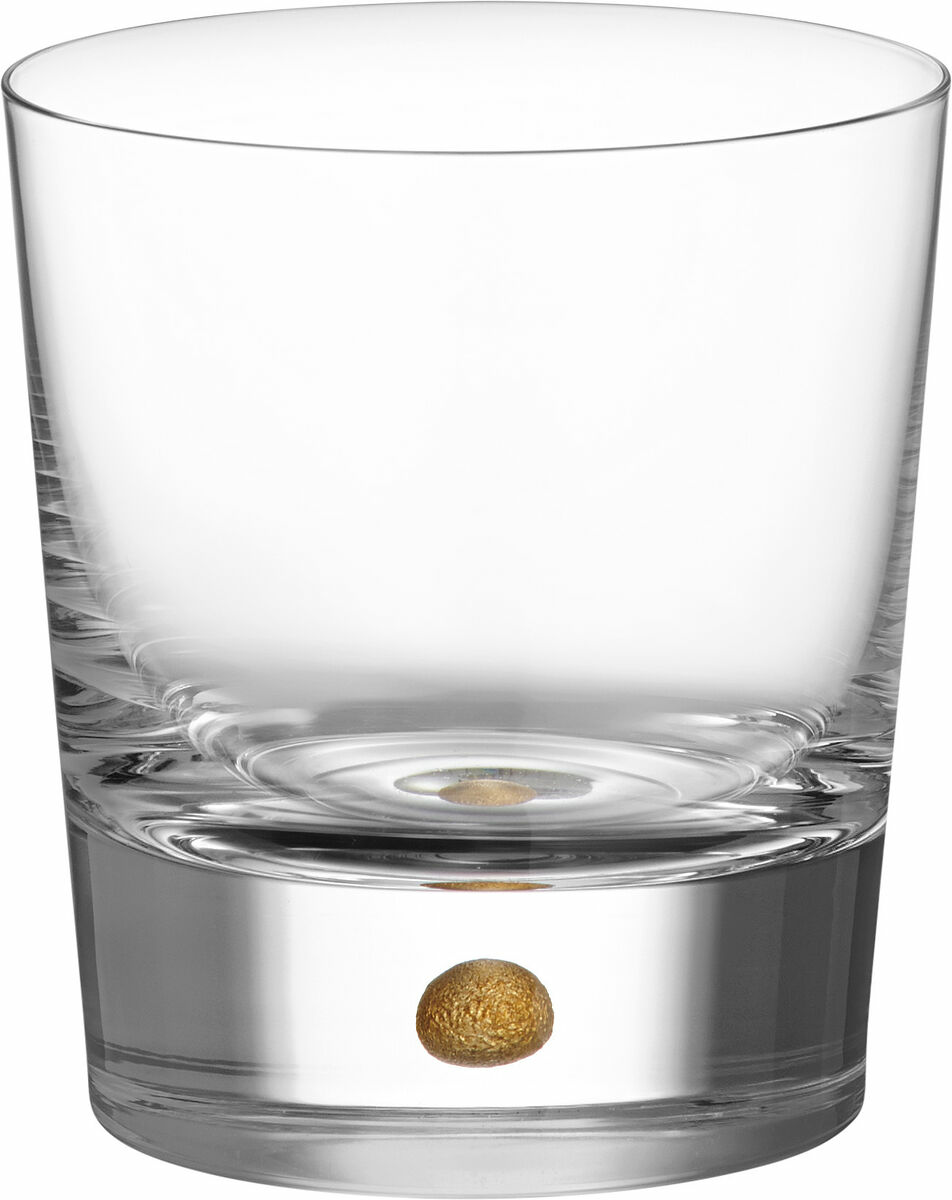 Orrefors hantverkare och Erika Lagerbielke har länge försökt fylla Intermezzos karakteristiska bubbla med guldpigment. Äntligen finns den där, inbakad i det kristallklara glaset – en matt guldskimrande droppe. Double Old Fashioned glaset rymmer 40 cl och passar bra för servering av olika spritdrycker eller cocktails med eller utan alkohol. Det är ett stort glas med plats för mycket is, drinkmixers och juicer. Glaset är munblåst i Sverige av våra skickliga glasblåsare.