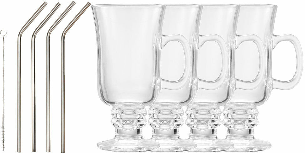 På vintern är det extra gott med Irish coffe. Detta Iona Irish coffe set består av fyra klassiska glas med öra och sugrör i rostfritt stål så att du kan servera drinkarna på ett snyggt sätt.