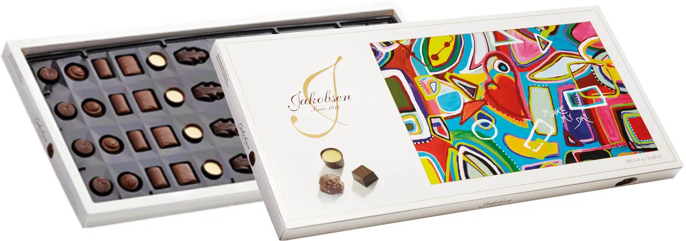 En stor jättefin chokladask som har ett fantastikt konstverk på framsidan som har blivit en succé och sålts under många år. Denna ask innehåller många fina och exklusiva praliner med bl.a. de mycket välgjorda och välsmakande danska grodorna. Asken heter därför "Konst".