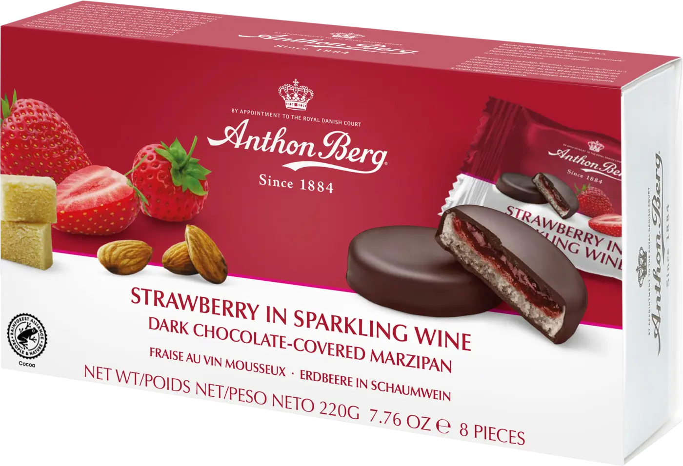 Anthon Bergs små goda "Marsipantårtor", mörk choklad fylld med ljuvlig marsipan och jordgubbar i mousserande vin. Varje "tårta" är separat förpackad i asken. Även god till en kopp kaffe. Utan palmolja.