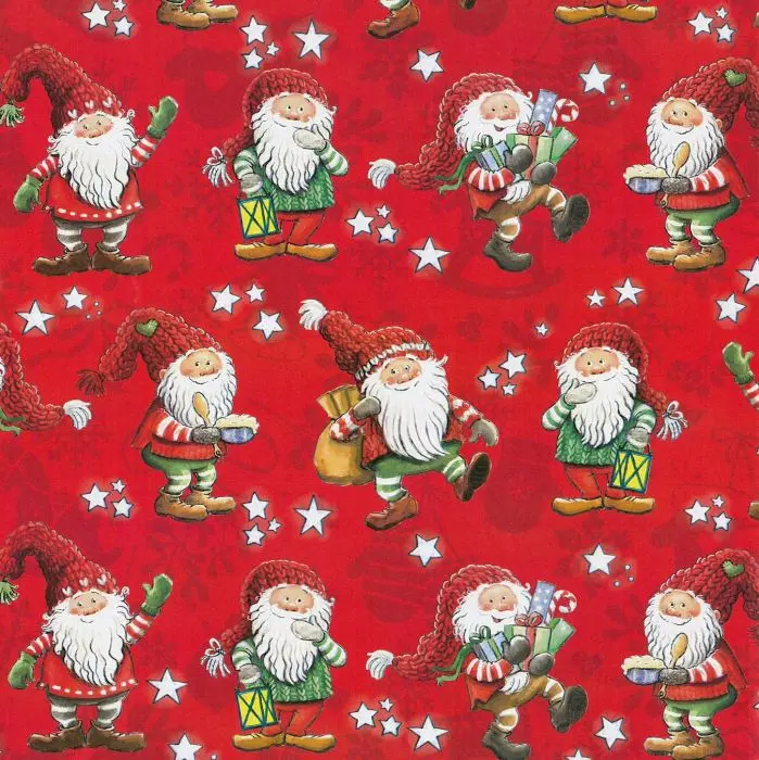 Röd bottenfärg med små vita stjärnor och tomtar som bär på julklappar och julgröt. I bakgrunden syns mönster av vantar, gunghästar, mistlar och annat som hör julen till i en dov röd ton. Färgerna går i olika nyanser av rött, grönt, brunt, blått och gult.