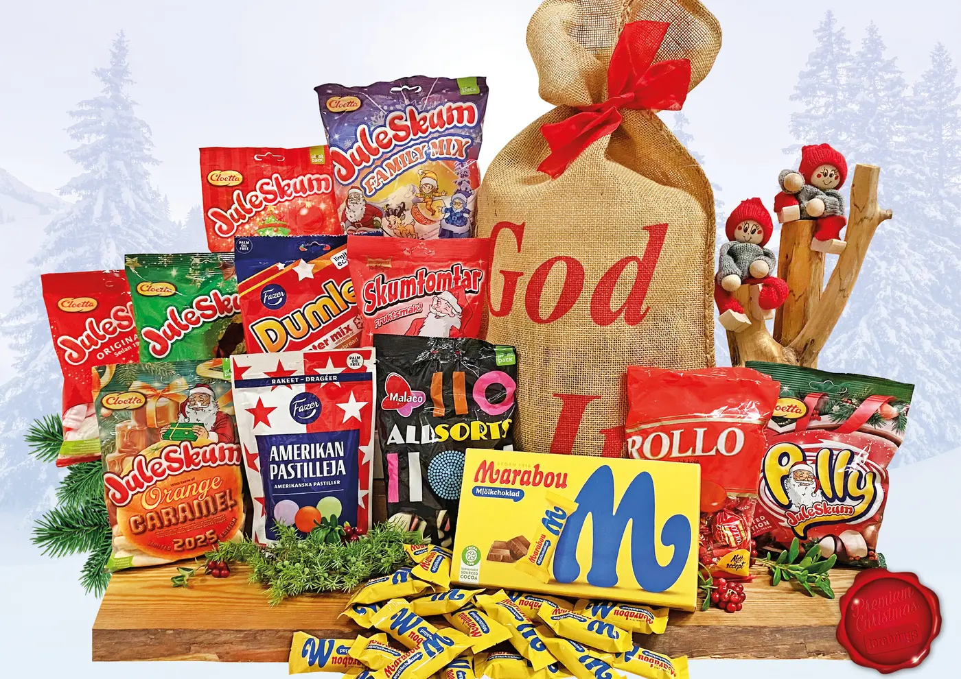 Tolv klassiska julkonfektyrer med hög kvalitet och god smak packas omsorgsfullt av tomteverksta’n i Jutesäck God Jul 42x75 cm med rött band. (OBS innehållet i denna julsäcken får endast plats i 42x75 cm) Nettovikt: 2110 g. Bruttovikt: 2378 g.