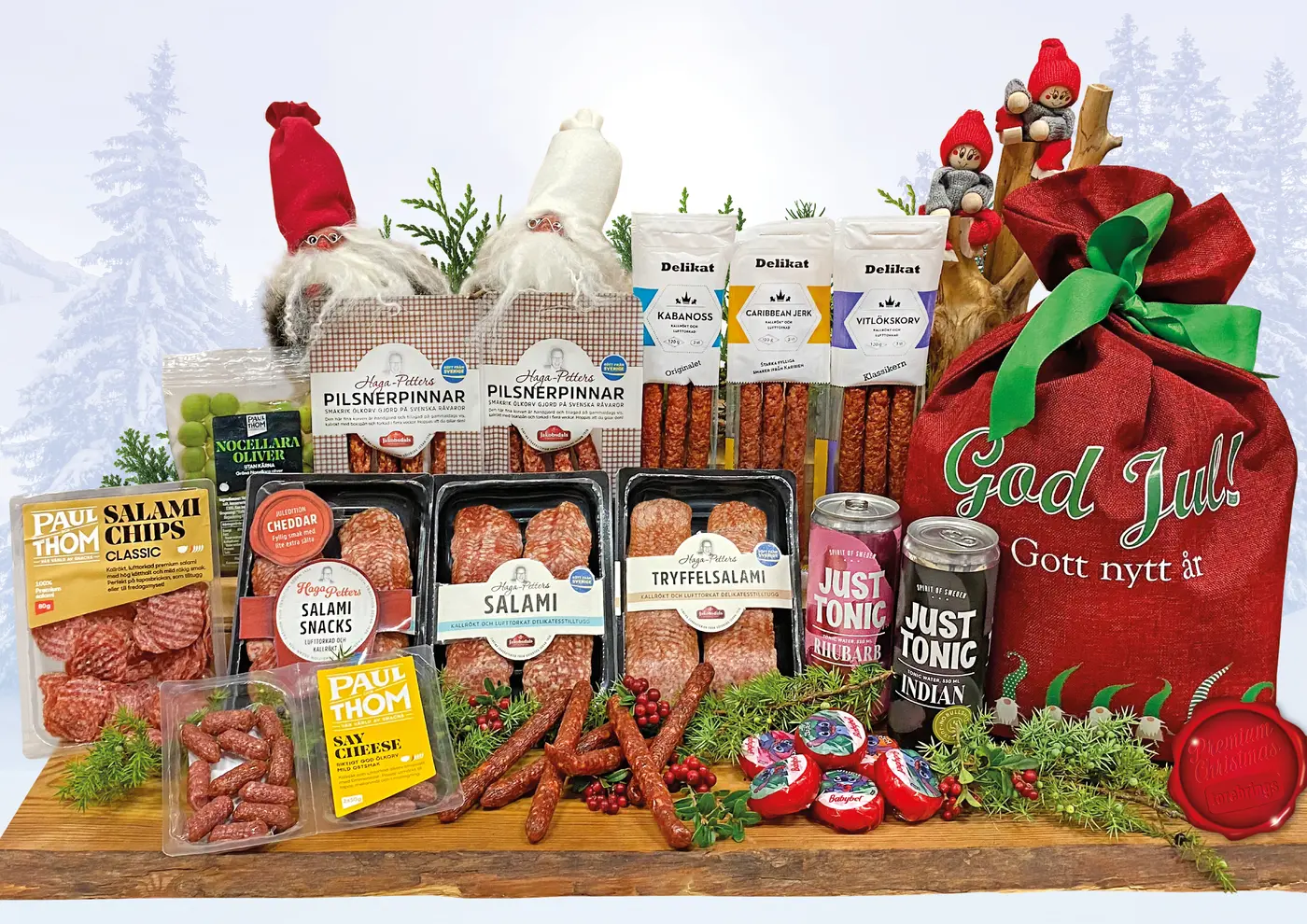 Dessa femton varor packas omsorgsfullt av tomteverksta’n i Julsäck Röd Tomtedans 30x50 cm med grönt band. Nettovikt: 1960 g. Bruttovikt: 2300 g. Förvaras i rumstemperatur.