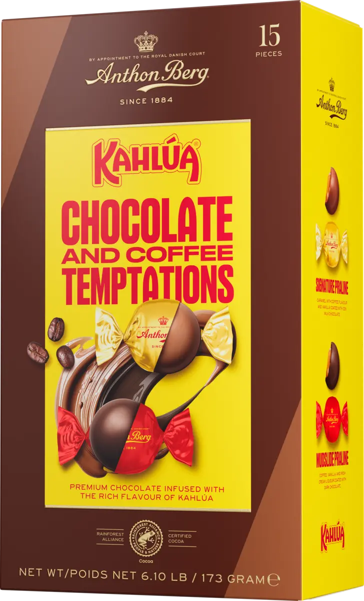 Anthon Bergs Kahlua en ask med inslagna praliner, en variant med mjölkchoklad med krämig karamelfyllning och noter av kaffe och vanilj, den andra varianten med mörk chokladfyllning med noter av kaffe, vanilj och Irländsk krämlikör.