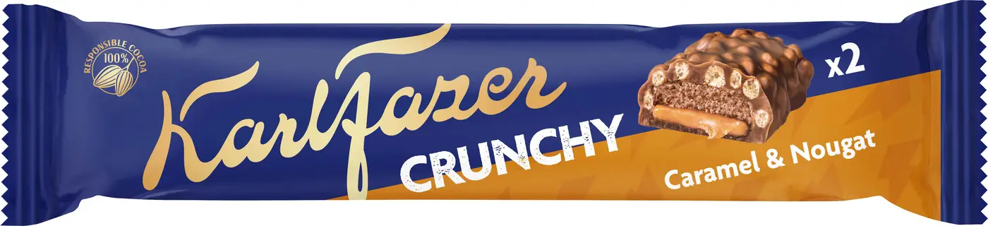 Karl Fazer Crunchy har smak av utsökt kola och mjuk hasselnötsnougat. Stycksaken är överdragen med salta vetepuffar och äkta sammetslen Fazer mjölkchoklad – en fulländad kombination av crunchig energi och njutning som stillar även ett stort godissug. Förpackningen innehåller två stora bitar. Karl Fazer mjölkchoklad är en älskad chokladklassiker som har fått sin unikt fylliga smak av bästa möjliga råvaror alltsedan 1922. All Fazers choklad tillverkas av 100 % ansvarsfullt producerad kakao. Smaka, njut och bli förtjust!