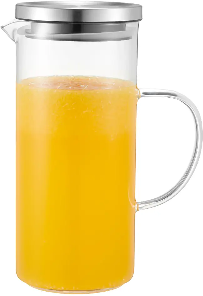 Servera saft och smaksatt vatten ur tillbringaren Kay. Glastillbringaren utmärks av sin moderna design med smalt handtag. Det rostfria locket sluter dessutom tätt och håller såväl kylskåpslukt som smådjur borta.