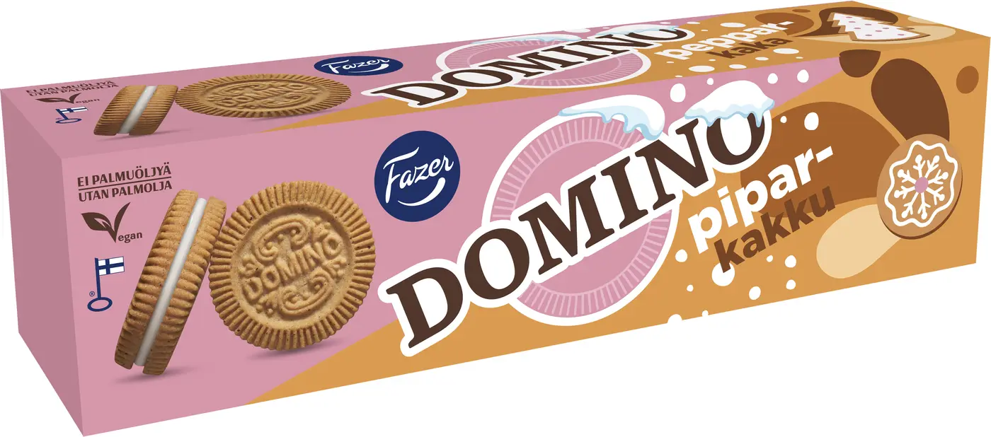 Skapa julstämning med Domino Pepparkaka – den perfekta julkakan! Våra klassiska kex har fått en härlig vintersmak med pepparkaka och en ljuvlig vaniljfyllning kryddad med kanel. Domino Pepparkaka är bakad utan palmolja och passar även veganer och är därför perfekt att bjuda på vid julfester eller att ge bort som en uppskattad gåva.