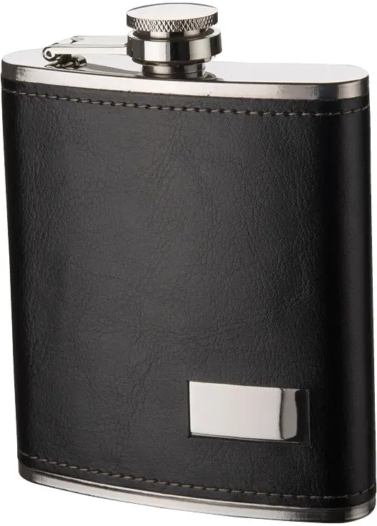 Läcker fickplunta klädd i svart läderimitation med en ruta där du kan gravera in ägarens namn. Fickpluntan är tillverkad i rostfritt stål och finns i flera olika storlekar. Denna fickplunta rymmer 2,1 dl.