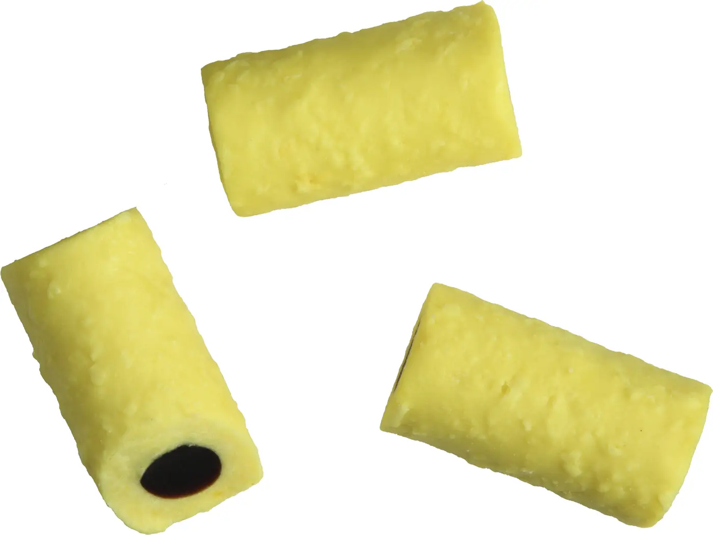 Gul kokosbit med en kärna av lakrits. Utan gelatin. Innehåller endast naturliga färgämnen.