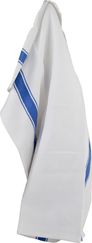 Vit kökshanduk med blåa ränder som passat utmärkt för såväl det professionella köket som i hemmaköket. Handuken är tillverkad i en slitstark blandning av bommul och lin, fri från gifter och kemikalier certifierad av STANDARD 100 by OEKO-TEX®.