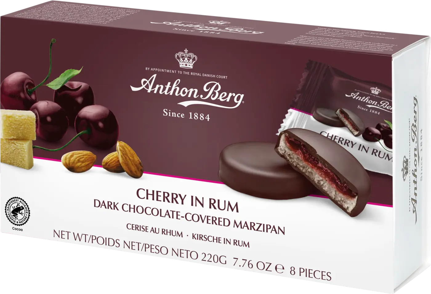 Anthon Bergs små goda "Marsipantårtor", mörk choklad fylld med ljuvlig marsipan och körsbär i rom. Varje "tårta" är separat förpackad i asken. Även god till en kopp kaffe. Utan palmolja.