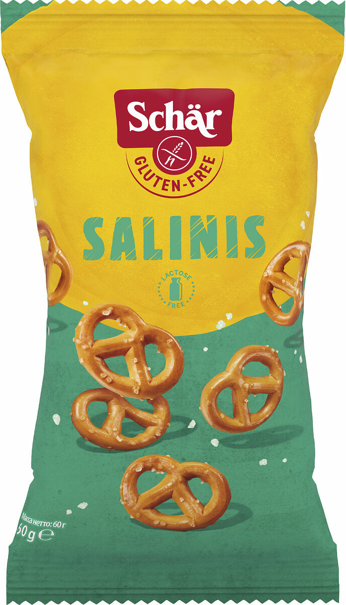 Schär Salinis är knapriga och glutenfria salta kringlor. Lagom stora och passar perfekt som tilltugg, mellanmål eller för att ta med sig i väskan och på picknicken. Fri från gluten, vete och laktos. Utan tillsats av mjölk, ägg och konserveringsmedel. Kan användas inom FODMAP-låg kostbehandling.