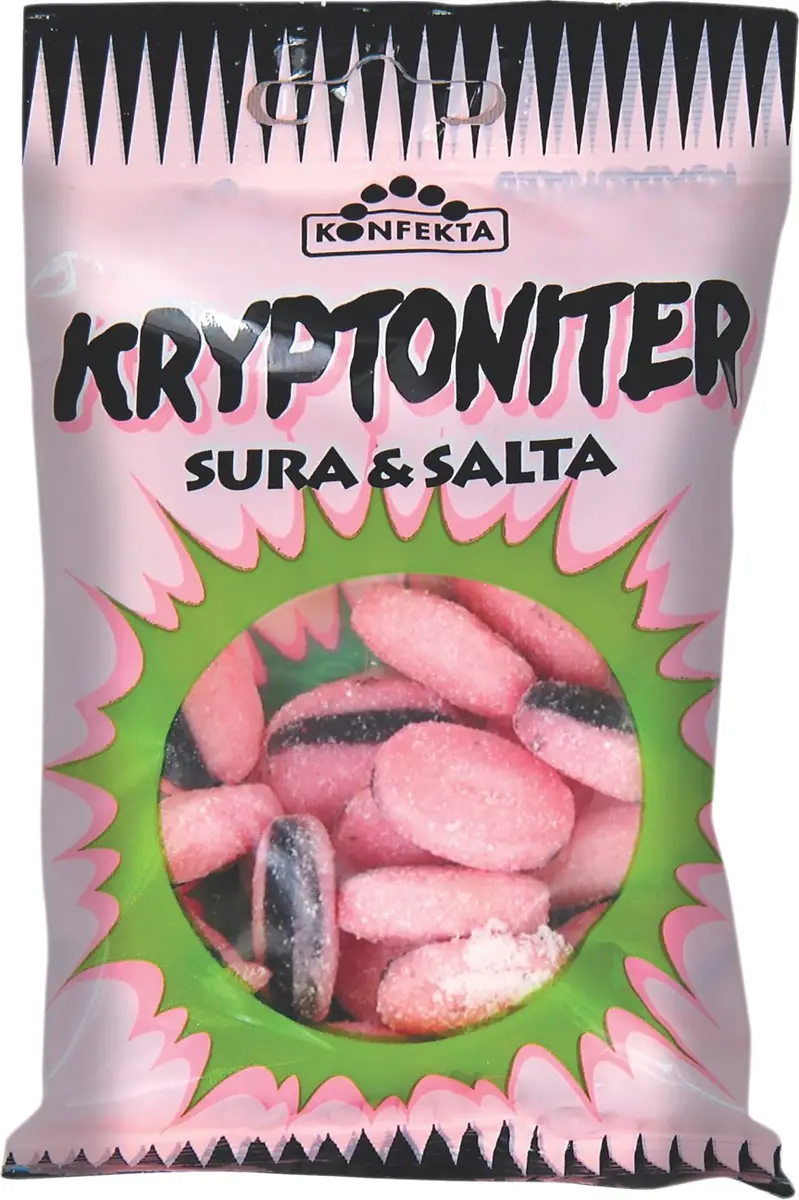 Hårda sura och saltfyllda karameller. Största andelen av Konfektas godis produceras i Sverige. Påsarna görs av polypropen och är återvinningsbara, de sorteras som mjukplast.