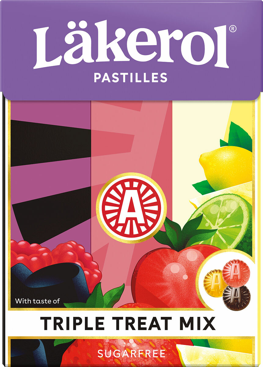 Läkerol Classic Triple Treat Mix är en mix av pastiller i tre olika fräscha, fruktiga och moderna smaker. Lemon, Strawberry Lime & Raspberry Licorice är den en perfekta blandningen av sött, syrligt och salt. Pastillerna är sockerfria och veganska.