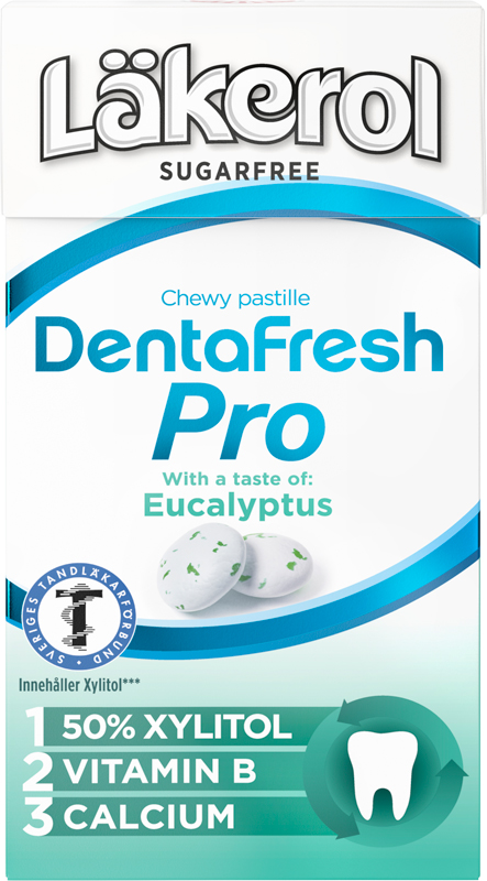 sötningsmedel/sødestoffer (xylitol 50%, maltitoler), förtjocknings-/fortykningsmiddel (gummi arabicum), vegetabiliska fetter/oljor (shea, palm), kalcium-/calciumcarbonat, aromer, emulgeringsmedel/emulgator (E471, rapslecithin), färgämnen/farvestoffer (E100, E133, E171), fuktighetsbevarande medel (glycerol), ytbehandlings-/overfladebehandlingsmiddel (karnaubavax/voks), niacin (B3).