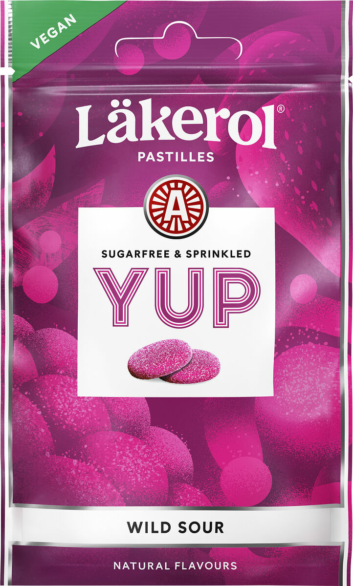 Läkerol YUP Wild Sour har en syrlig smak av våra mest älskade bär. En frisk och mjuk pastill med ett tunt lager av xylitolkristaller för en perfekt balans mellan sött och surt. Pastillen är både sockerfri och veganvänlig.