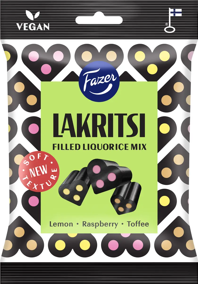 Fazer Lakritsi mixpåse överraskar med mjuka, fyllda lakritsbitar i söta och färgglada hjärtformer. Välj din favorit bland kola-, citron- och hallonsmakande fylld lakrits! Njut av påsen själv eller dela en hjärtformad godisupplevelse med din vän. Vegansk.