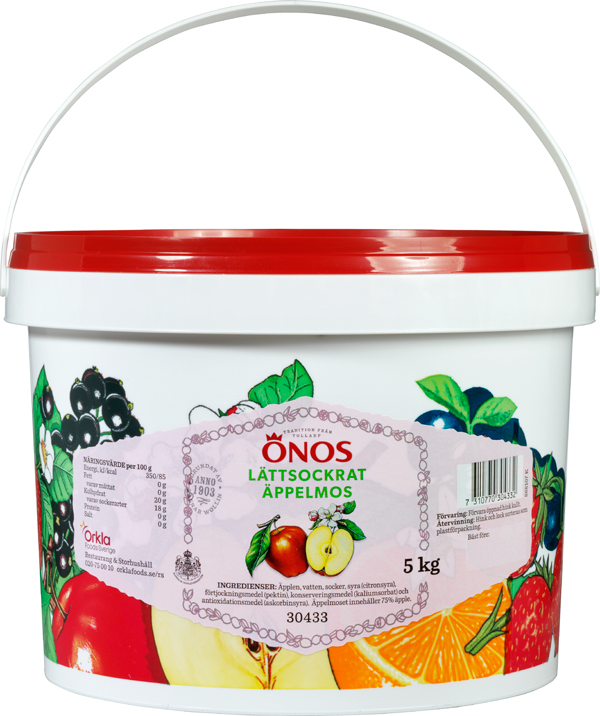Lättsockrat Äppelmos kokt på svenska äpplen från Österlen. Fyllig och god smak, precis som om du plockat äpplena själv. 5 kg.