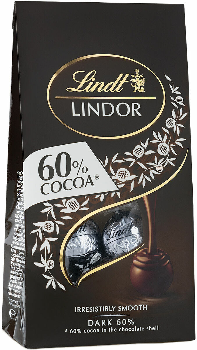 Inspirerad av ett hemligt recept har Lindts choklad mästare skapat ett mästerverk i choklad; Lindor. Det mörka skalet av finaste Lindt choklad består av 60% kakao och innesluter en krämig chokladfyllning. De goda chokladkulorna väger 12,5 gr.