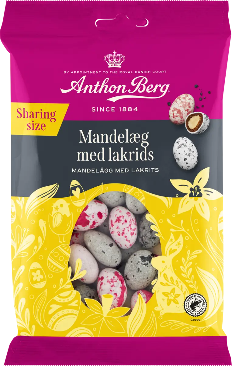 Anthon Bergs Mandelägg med lakrits, rostade mandlar med ett lager av mjuk mjölkchoklad och ett skal av spröd sockerdragé med lakritssmak i en större påse.