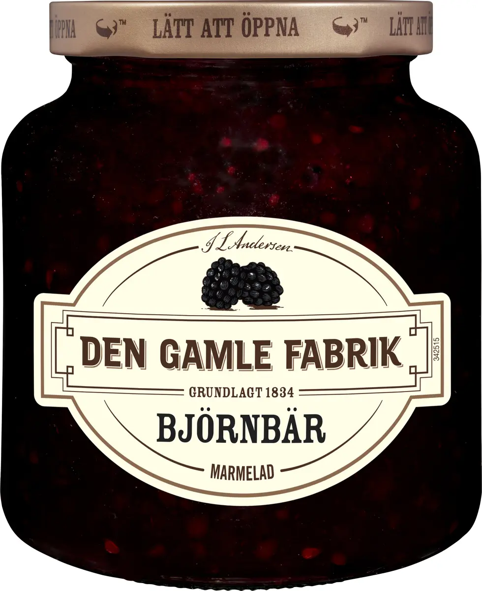 Björnbärsmarmelad från Den Gamle Fabrik, en fantastiskt god marmelad med härlig smak av söta björnbär. Marmeladen är perfekt både på frukostbordet och till ostbrickan. Och det bästa efter smaken är det lättöppnade locket! Den Gamle Fabrik har tillverkat marmelader av de finaste frukterna och bären i över 175 år. Precis som förr i tiden tillverkas marmeladen i öppna grytor under varsam upphettning. Det är ett vinnande koncept för att bevara råvarornas naturliga smak och bibehålla de goda bär och fruktbitarna som tillför det lilla extra. Få mer tips om marmeladen på dengamlefabrik.se