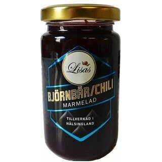 Den här svensktillverkade marmeladen från Hälsingland är en fantastisk kombination av björnbär och chili. Den passar utmärkt till ostbrickan.