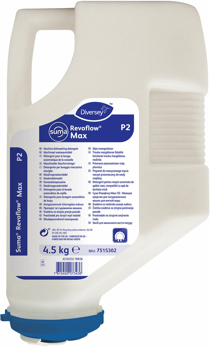 Suma Revoflow Max P2 är ett koncentrerat, maskindiskmedel som effektivt rengör och löser beläggningar från fett och stärkelse, speciellt sammansatt för mjuka och medelhårda vatten.