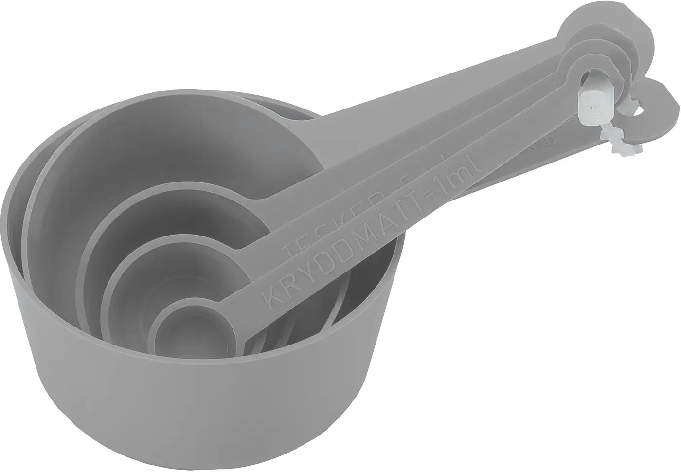 5 delar innehållande 1 dl, 1/2 dl, 1 msk, 1 tsk, 1 krm.