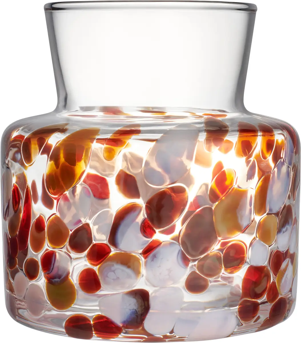 Meadow har en blomsteräng som både inspiration och uttryck. Det är en serie vaser som gör sig lika väl på egen hand som med ett fång blommor. Tack vare den glaskrossteknik som används i tillverkningen är varje vas unik. Den lilla vasen Fall är som gjord för att omfamna en lite mindre bukett, eller på egen hand lysa upp ditt hem med höstens varma färger. Design av Sara Persson.