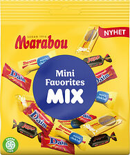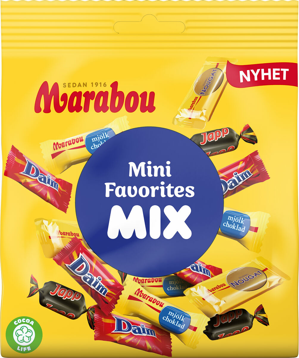Marabou Mix Mini Favorites samlar minivarianter av Marabous mest uppskattade stycksaker i en och samma påse. Daim, Japp, Dubbelnougat och Mjölkchoklad bildar ett svårslaget Dreamteam. Perfekta att dela med vänner och familj, eller varför inte njuta av själv i lugn hemmamiljö. Genom Cocoa Life, vårt program för en hållbar kakaoproduktion, bidrar Marabou till att kakao odlas på rätt sätt, för att skydda planeten och respektera mänskliga rättigheter i vår värdekedja. Läs mer om Cocoa Life här www.cocoalife.org.