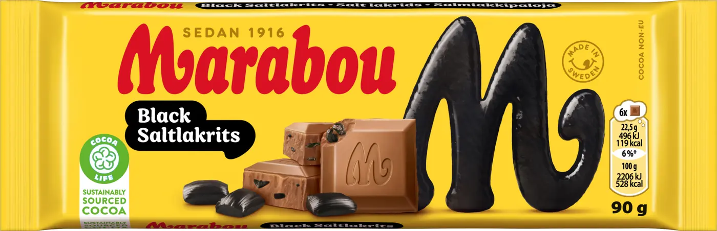 Marabou Black Saltlakrits är en Marabou Mjölkchokladkaka med bitar av saltlakrits som passar för alla tillfällen. Genom Cocoa Life, vårt program för en hållbar kakaoproduktion, bidrar Marabou till att kakao odlas på rätt sätt, för att skydda planeten och respektera mänskliga rättigheter i vår värdekedja. Läs mer om Cocoa Life här www.cocoalife.org.