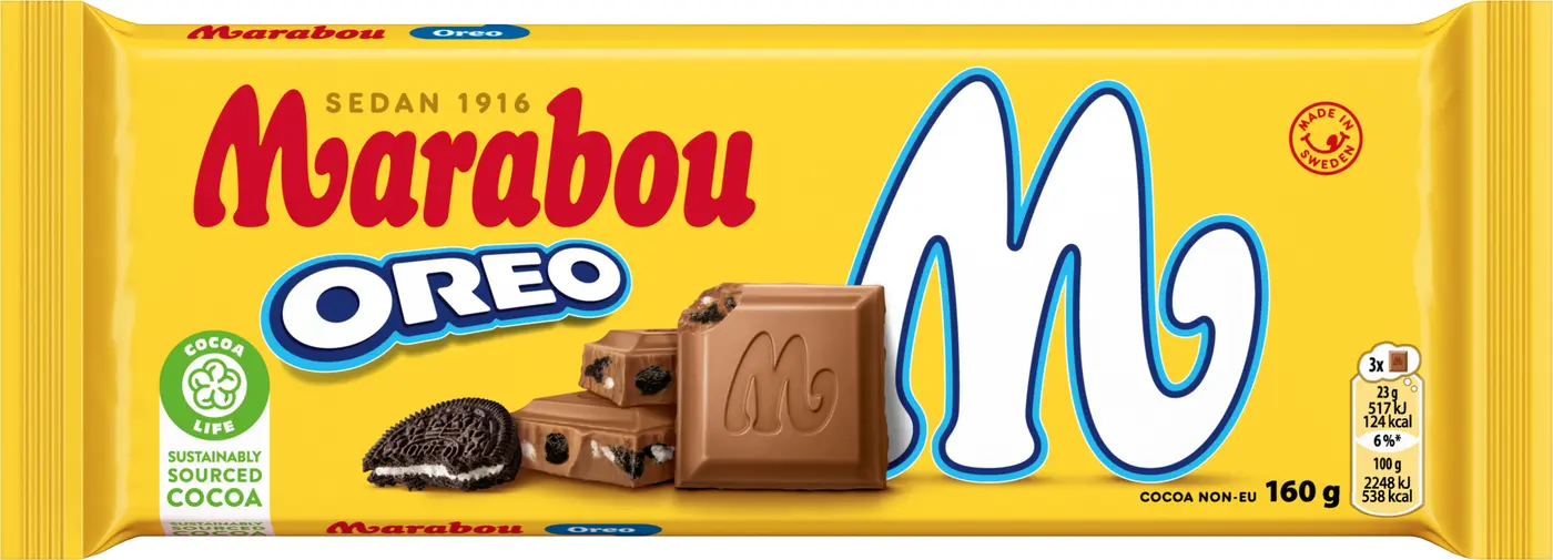 Marabou Oreo är en Marabou Mjölkchokladkaka med krossade bitar av Oreo som passar för alla tillfällen. Genom Cocoa Life, vårt program för en hållbar kakaoproduktion, bidrar Marabou till att kakao odlas på rätt sätt, för att skydda planeten och respektera mänskliga rättigheter i vår värdekedja. Läs mer om Cocoa Life här www.cocoalife.org.