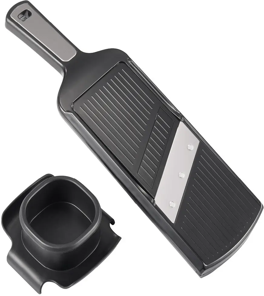 Denna mandolin är ett mångsidigt köksverktyg som gör det enkelt att skiva och strimla grönsaker med precision. Justera enkelt skivtjockleken med ratten på baksidan och välj mellan olika blad för julienne eller skivning. Använd matvaruhållaren för säker hantering och skydd av fingrarna. Perfekt för att snabbt förbereda ingredienser till sallader, grytor och wok. Rengör mandolinen för hand för bästa hållbarhet och skärpa.