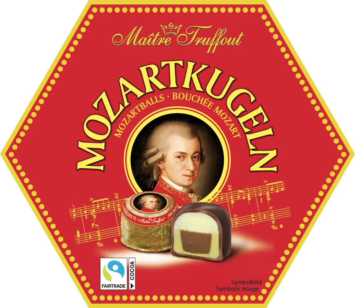 De delikata Mozartkulorna från Maître Truffout är fyllda med pistagemarsipan, marsipan och hasselnötsnougat, täckta med ett lager av mjölkchoklad och fin mörk choklad.