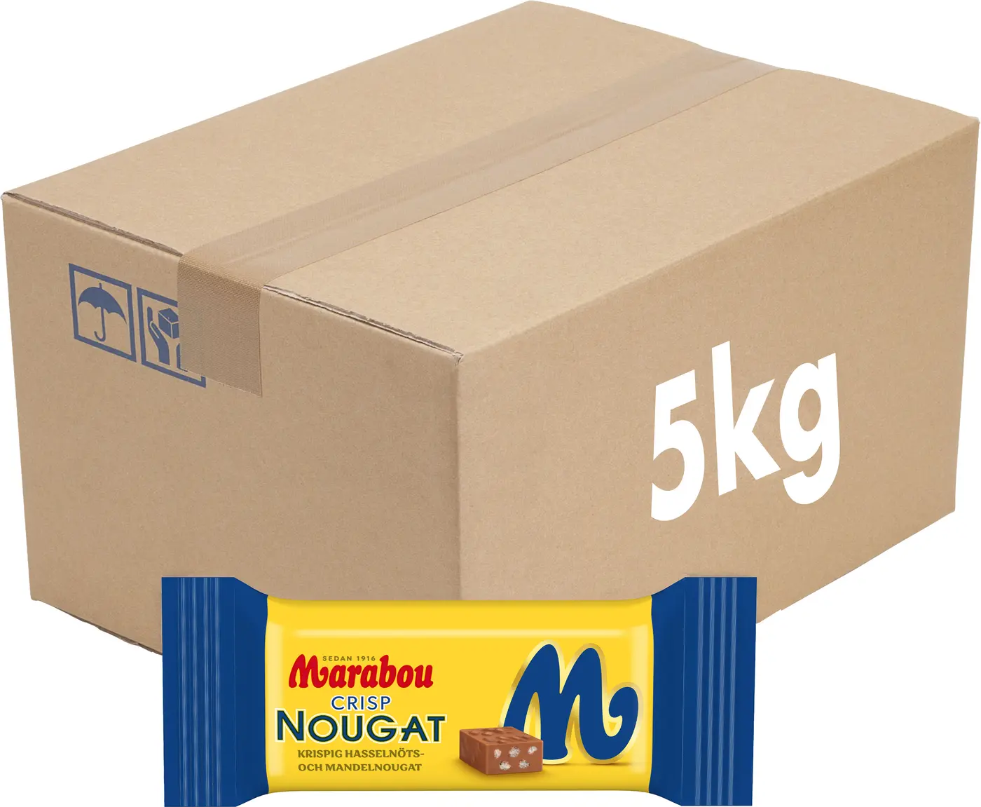 Njut av utsökta nougat krisp. Krämig och len hasselnöts och - mandelnougat som smälter i munnen med krispiga bitar. Varje tugga blir en härlig blanding av fylligt, mjukt och krispigt. Oemotståndlig smakupplevelse som passar till alla tillfällen, att dela eller avnjuta helt själv. Nougat klassiker; nu i lösvikt med extra krisp. Genom Cocoa Life, vårt program för en hållbar kakaoproduktion, bidrar Marabou till att kakao odlas på rätt sätt, för att skydda planeten och respektera mänskliga rättigheter i vår värdekedja. Läs mer om Cocoa Life här www.cocoalife.org.