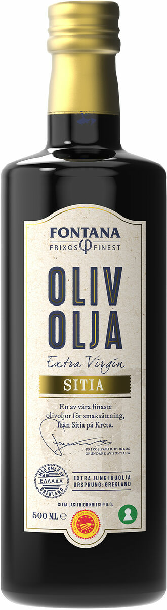 Fontana extra virgin olivolja är en ursprungsskyddad PDO-märkt olivolja från olivlundarna i Sitia på nordöstra Kreta. Oljan har en vackert grön färg och en fin, fruktig och elegant smak. Perfekt till fisk, sallad eller att njuta som den är på ett gott bröd.