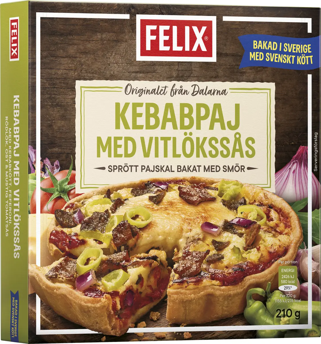 Felix Kebabpaj har en smakrik fyllning gjord på svenskt kebabkött, feferoni, rödlök och ost i en mustig tomatsås toppad med vitlökssås. Pajskalet är sprött och bakat med smör för den goda smakens skull! Snabb & god lunch på bara 3,5 minuter! Felix paj passar perfekt som en lätt lunch eller tillsammans med en sallad. Snabbt, gott och enkelt! Bakad med omsorg i Dalarna. Läs mer om Felix produkter på felix.se Smaklig måltid!