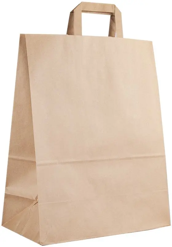 Klassisk bärkasse tillverkad av brunt kraftpapper med förstärkta platta handtag.