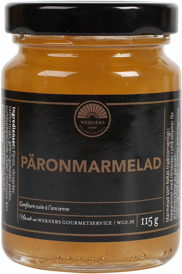 Marmelad som kokas traditionsenligt i kopparkittel med rörsocker i små volymer för att bevara bitar av päronen. Gifter sig med getost, krämiga grönmögelostar men även anklever.