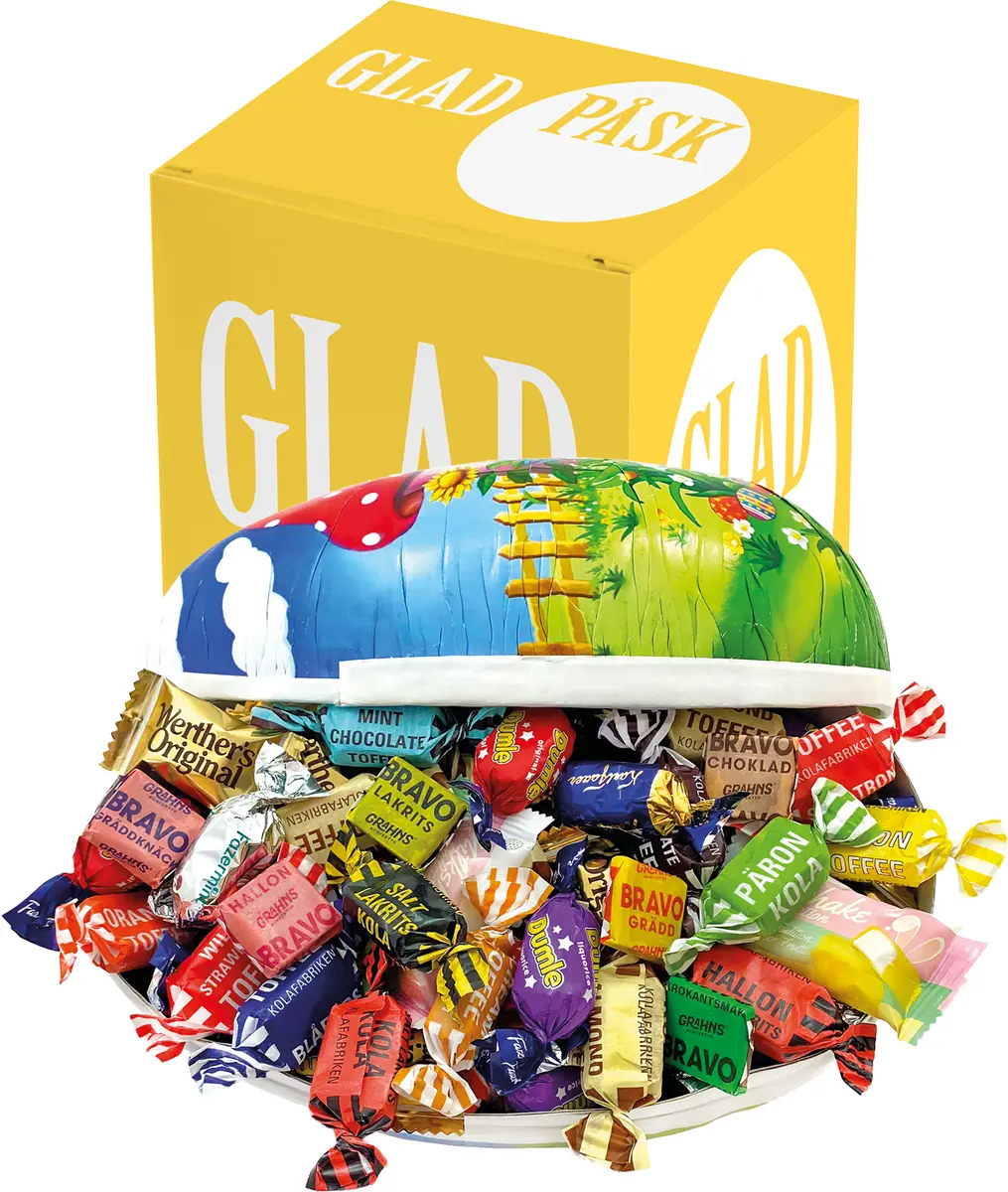 Påskägg 23 cm med Glad Påsk inslagen & twistad godisblandning inkl. gul påskbox Glad Påsk: